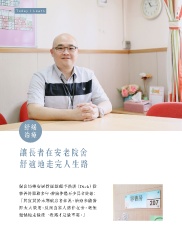 18 T o d a y I L e a r n 紓緩 治療 讓長者在安老院舍 舒適地走完人生路 保良 局樂 安 居 營 運 經 理 李 浩 淇(D i c k)從 事善終服務多年,曾陪伴過不少長者終老︰ 「其 實 對 於 末 期 病患 者來 說,治 療 未 能 發 揮太 大 效 用,反而由家人陪伴在旁,毫無 遺 憾地 走 最後 一段 路才是 最 重 要。」