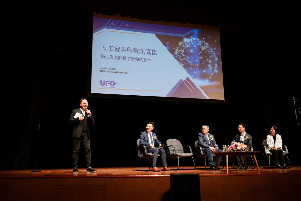 The seminar was divided into two parts. The first part featured a thematic sharing session, where Veteran journalists CHAN Siu-ping and LIU Zhi-wen discussed the topic of “True and False Information.” The second part included a forum discussion on the present and future development of AI, conducted by Professor Raymond LI, Executive Committee Member of the Hong Kong Press Council and Head of the Department of Journalism at Hong Kong Baptist University, Dr. CHAN Hung Cheong, Morton, Director of the Quality School Improvement Project and Professional Consultant at the Hong Kong Institute of Educational Research at The Chinese University of Hong Kong, and Mr. LEUNG Wing-lun, CEO of UFO Tech Academy, along with the coordinating principals.