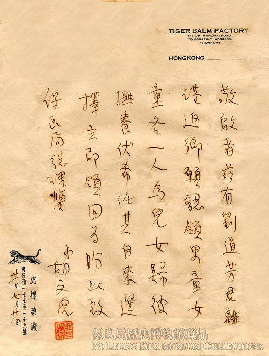 During the Japanese Occupation, Mr. Aw had donated several hundred thousands dollars of cash and materials to Po Leung Kuk as relief, despite not being a director of the Kuk. To commemorate his generosity during hardship, a portrait of Mr. Aw has been hung in Kwan Ti Hall.