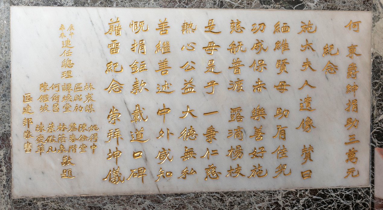 In 1930, Sir Robert Hotung donated $30,000 to the construction of the new headquarters of Po Leung Kuk in Causeway Bay, which was one-third of the total cost. To commemorate his donation, the hall on the ground floor of Main Building was named after his mother – the Ho Sze Shi Memorial Hall (also known as Kwan Ti Hall).
