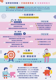 參賽學生將透過實地參訪和需求分析培養社會洞察力,並接受業界導師指導,掌握商業模式設計、產品原型開發等實戰技能,最後在評審團面前展示兼具商業可行性與社會影響力的創新方案。