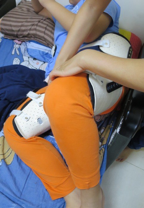 担心儿子未必能承受手术,阿平一边听医生解释,已一边泪流满脸。可幸是,手术前仍有一线转机,假若耀扬带上支架后,稳定到股骨位置,能够靠骨头增生,移正股骨,未必需要做手术。为了让儿子有机会逃过手术,阿平将耀扬接回家照顾。塑胶制支架套著耀扬的腰部至大腿,转身都有难度,更莫说要自理。阿平说:「真系当佢BB 咁,抱佢起身,推佢冲凉、去厕所。」