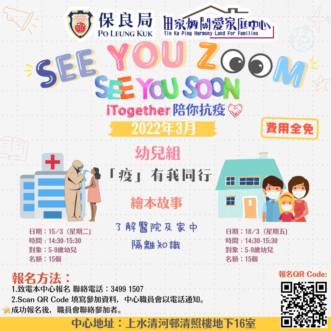 | 2022年3月18日 (星期五) | See You Zoom See You Soon︰ 「疫」有我同行 II(幼兒組)(已截止) 時間:2:30PM-3:30PM 以繪本故事,讓幼兒了解醫院隔離知識。 活動海報 詳情及報名連結 田家炳關愛家庭中心 |