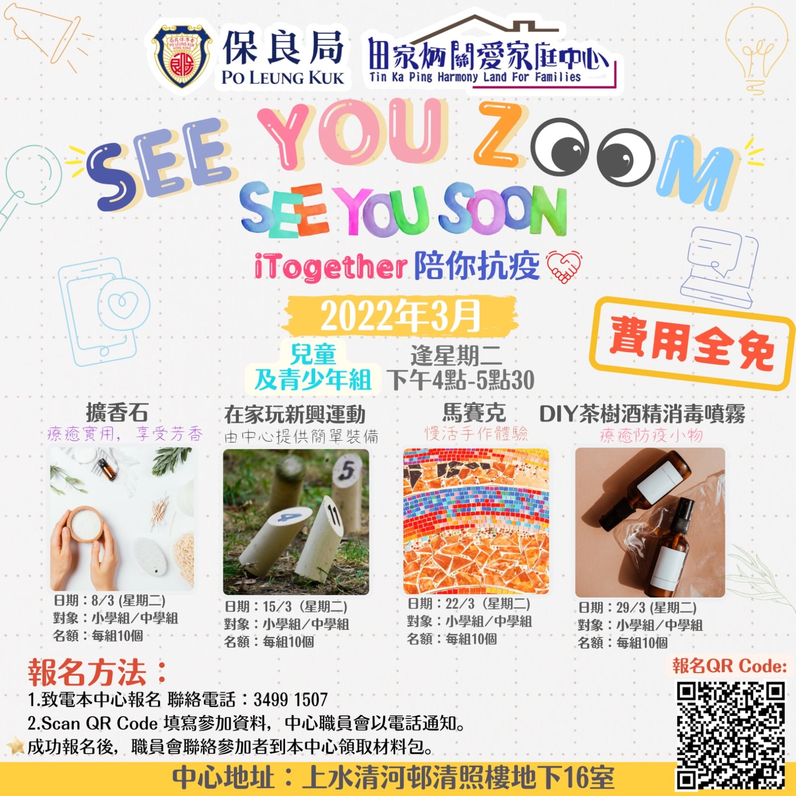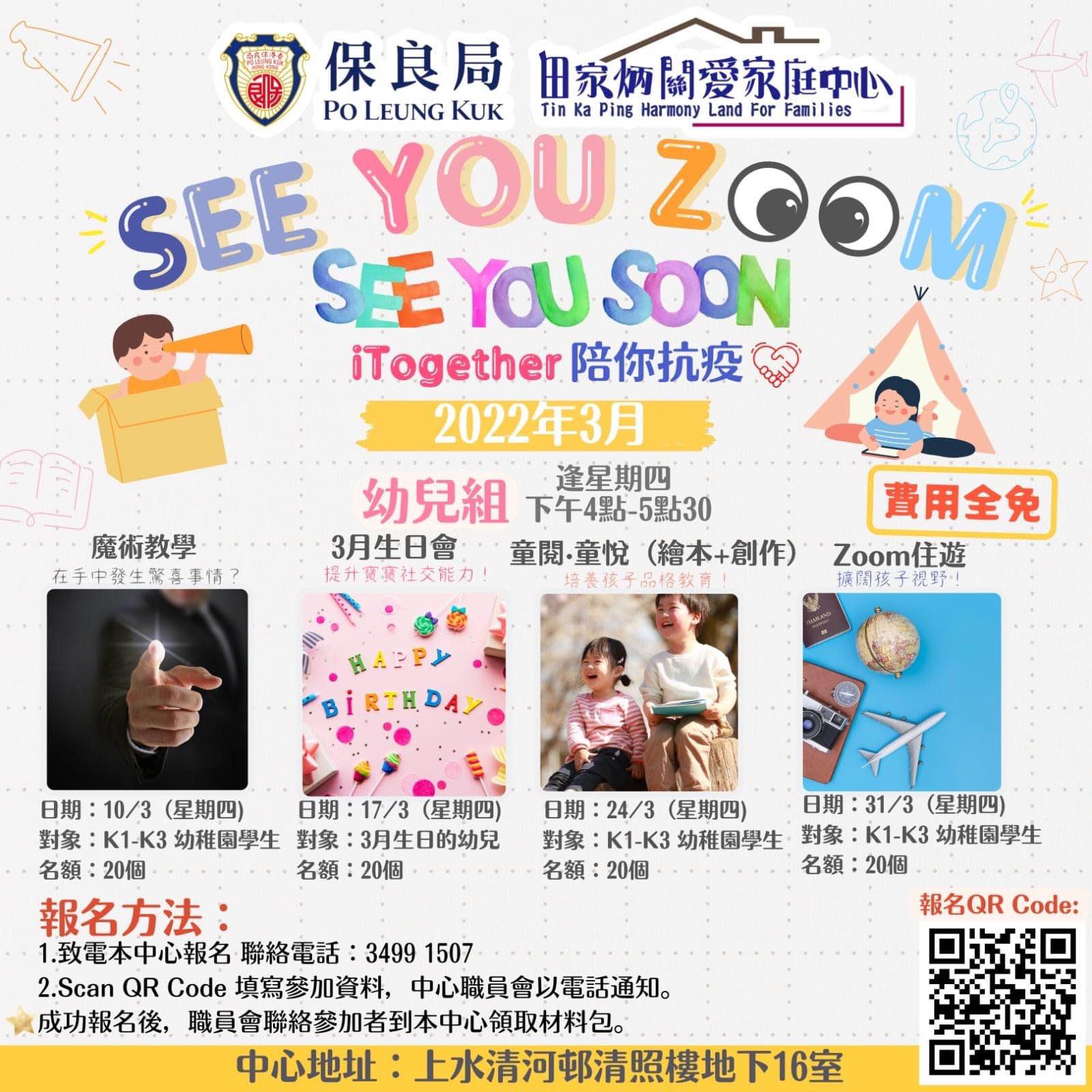 | 2022年3月17日 (星期四) | See You Zoom See You Soon︰ 3月生日會(幼兒組)(已截止) 時間:4:00PM-5:30PM 鼓勵在疫下善用科技,保持與人溝通及社交。 活動海報 詳情及報名連結 田家炳關愛家庭中心 |