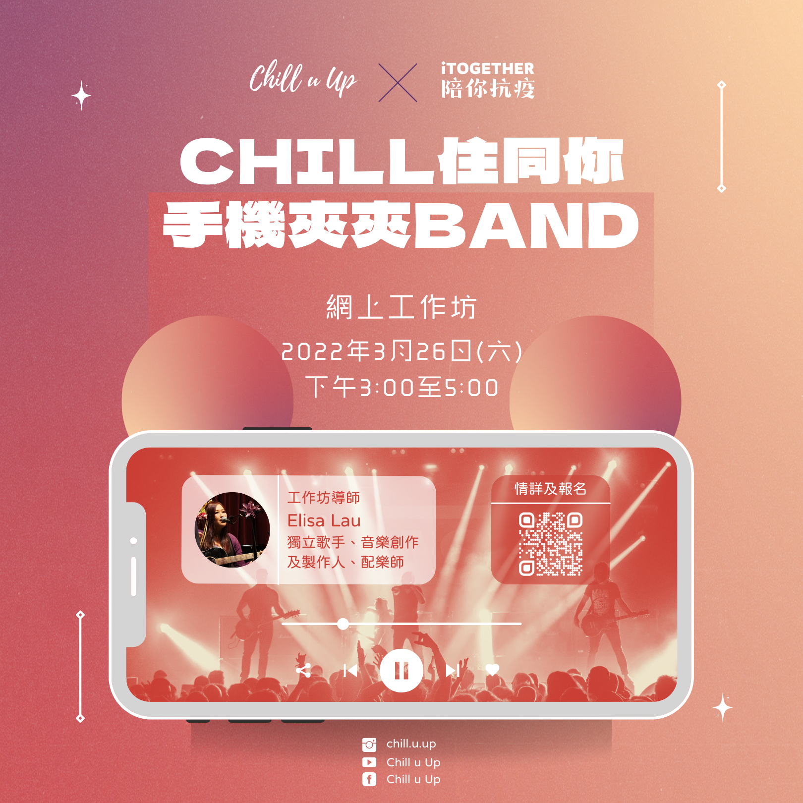 | 2022年3月26日 (星期六) | Chill住同你手機夾夾Band(已截止) 短時間內掌握使用手機應用程式製作音樂的基本技巧,即場完成一段自創的樂曲。 活動海報 詳情及報名連結 Chill u Up - 青少年身心靈平台 |