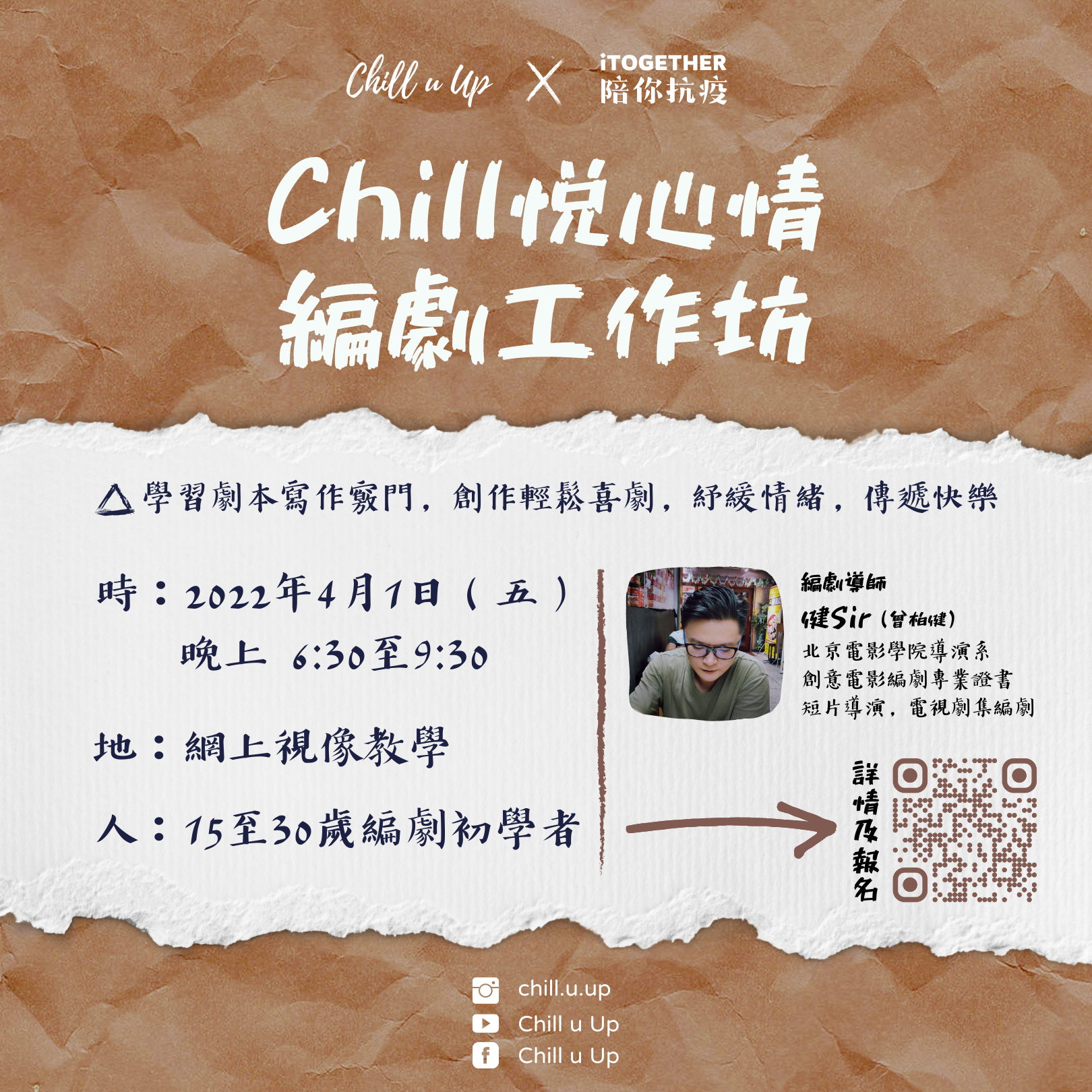 | 2022年4月1日 | Chill悅心情編劇工作坊(已截止) 短時間內掌握劇本寫作竅門,即場一起創作一齣短篇喜劇劇本。 活動海報 詳情及報名連結 Chill u Up - 青少年身心靈平台 |