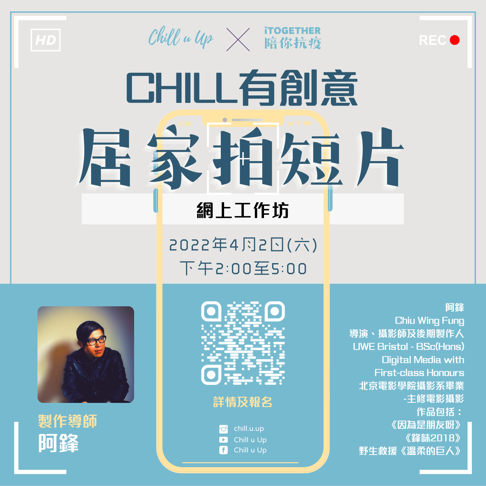 | 2022年4月2日 | Chill有創意・居家拍短片(已截止) 讓你短時間內掌握影片拍攝及剪接竅門,安在家中也可以用智能電話拍出別具創意的短片。 活動海報 詳情及報名連結 Chill u Up - 青少年身心靈平台 |