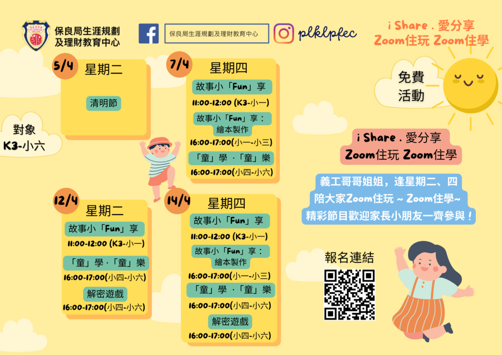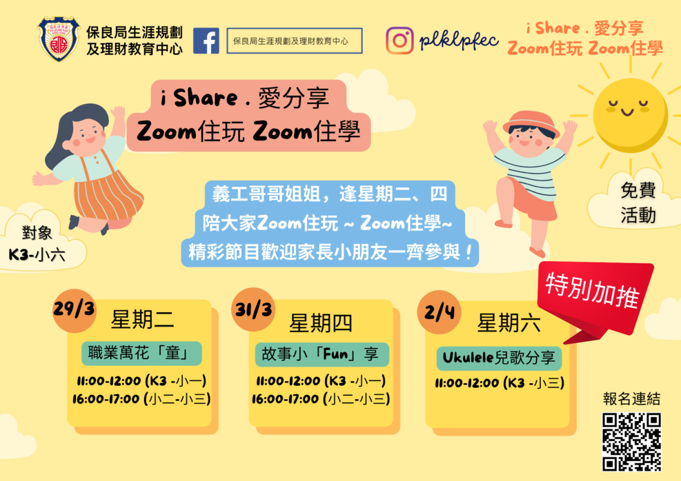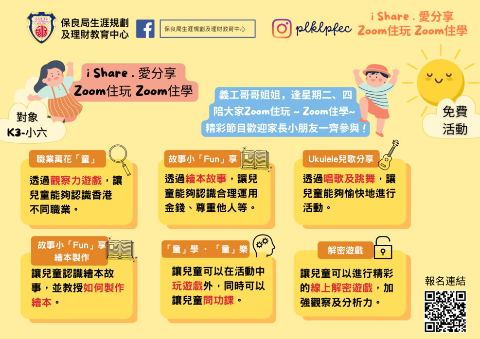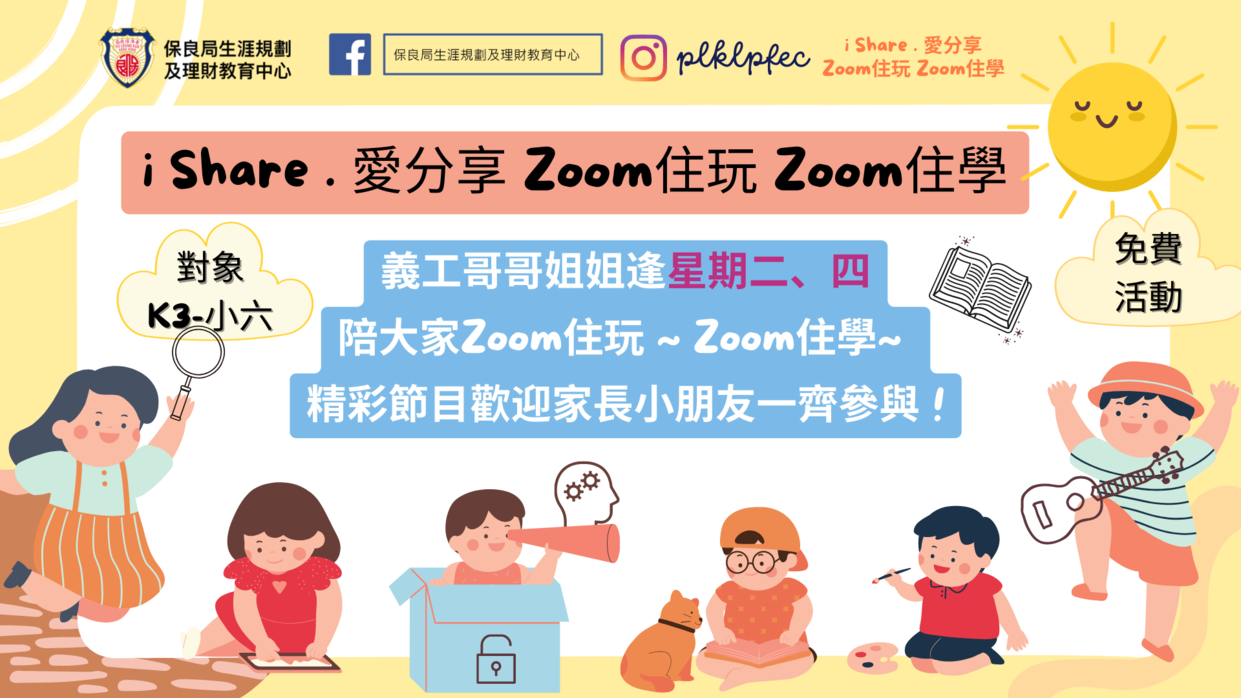 假期突然來臨,黎唔切幫小朋友安排假期活動? 由保良局兒童及青少年服務舉辦的「iShare.愛分享 - Zoom住玩 Zoom住學」活動就幫到你啦~ 活動集合一班充滿愛心既青年義工,青年義工的哥哥姐姐們精心為小朋友設計不同活動,分享時間‧分享才能去陪小朋友在假期一邊玩一邊學! 活動包括👾遊戲活動、🗣️故事小FUN享、🎼兒歌分享、🗝️解密遊戲、📖繪本製作等唔同形式的主題活動!