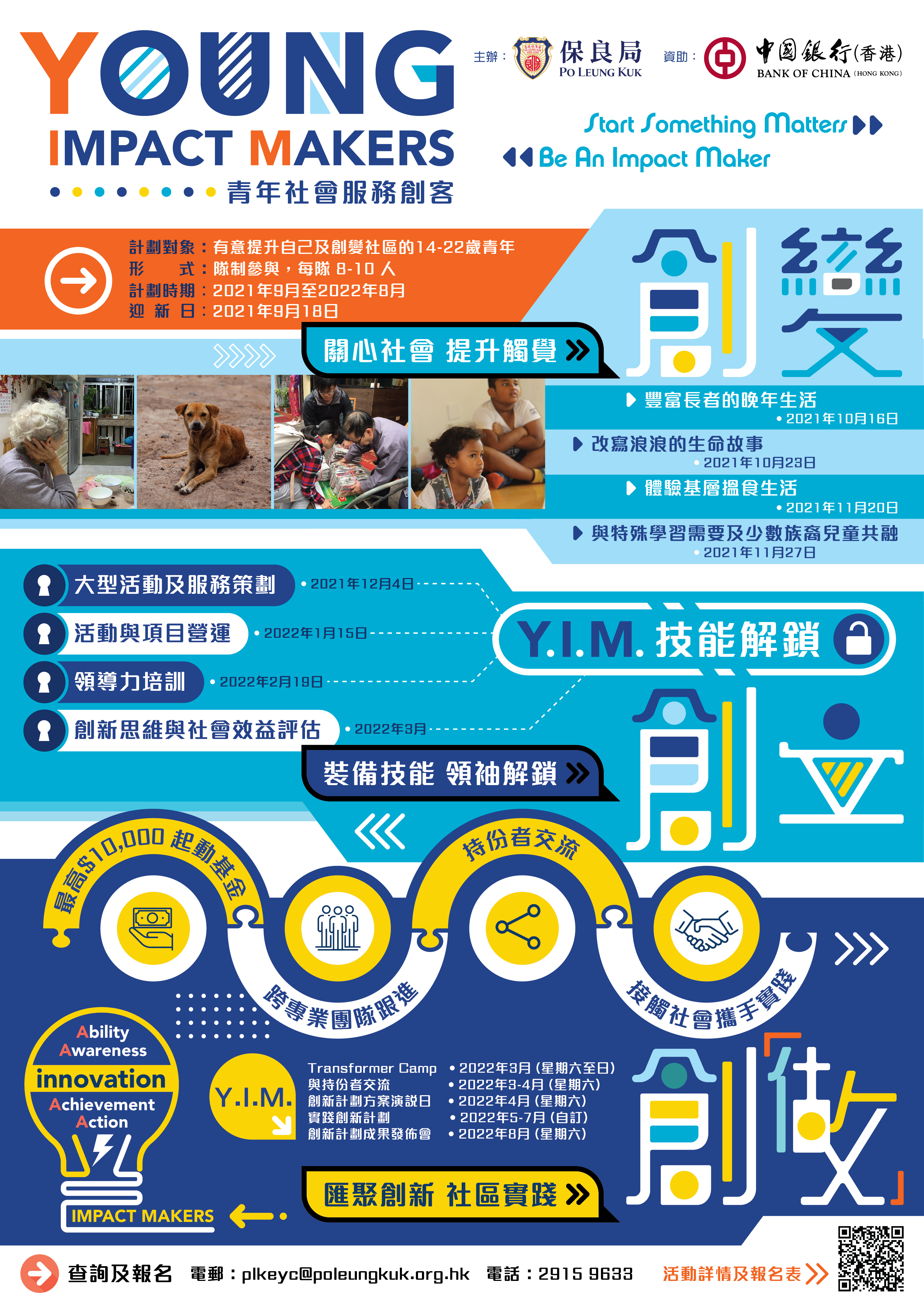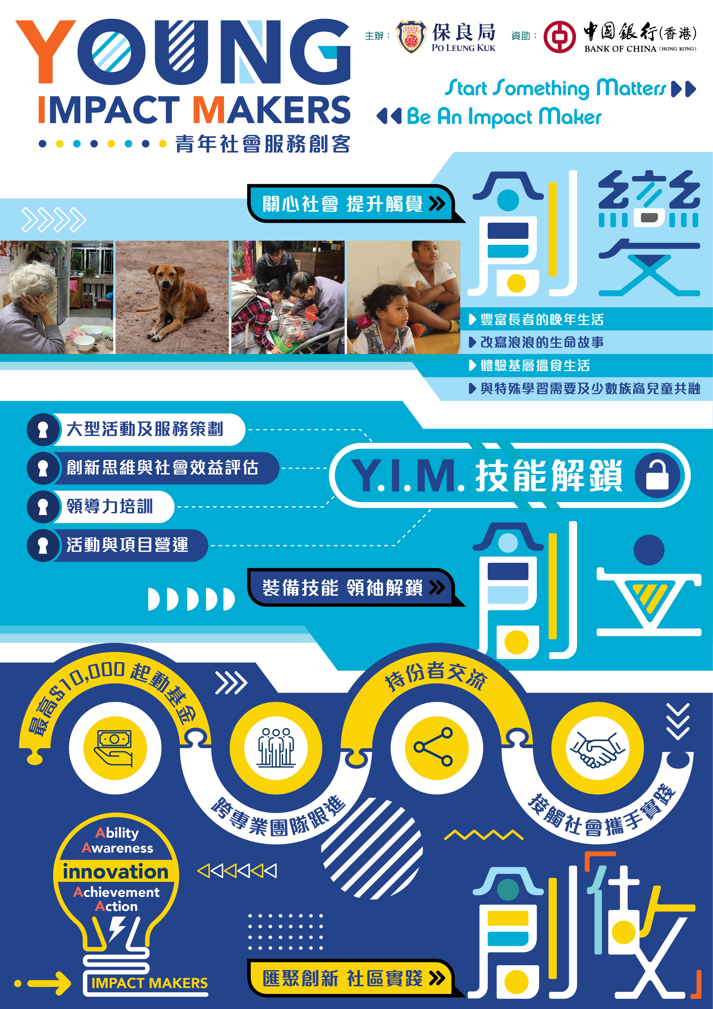 跳出傳統義工訓練固有內容,「Young IMPACT MAKERS」計劃透過【創變】、【創立】、【創「做」】三個系列,讓學生先從服務體驗反思不同社會議題,再接受系統式的培訓,當中更包括設計思維(design thinking),以及社會創新(social innovation)訓練。最後,匯聚學生創意,透過創新計劃方案演說爭取最高 港幣10,000 元的啟動基金,實踐社會創變活動,以提升社會共融意識,並培養創變信心。