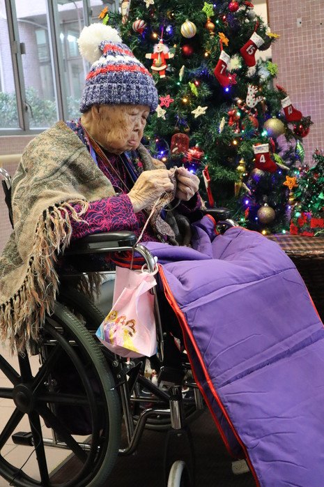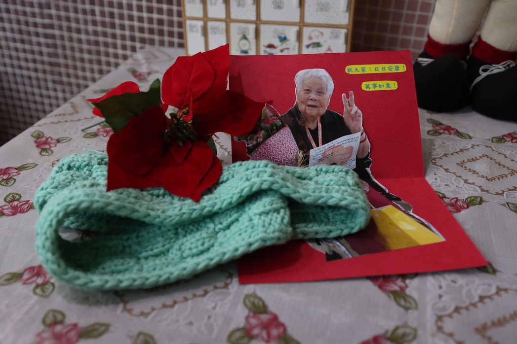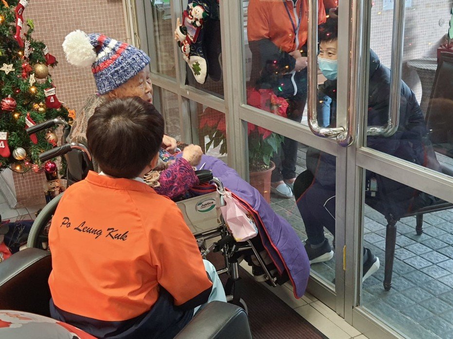 原本認知能力較弱的婆婆看到曾孫們,馬上精神百倍,準確說出每位曾孫的名字,更是感動落淚,「見到你哋真係好開心呀」,又立即戴起兒孫們送來的冷帽,婆婆則將親手編織的冷頸巾送予兒孫們。陳七婆婆的孫女李小姐表示,今年是第一次節日時不能一家人與婆婆一起過節,感謝院舍職員在日常繁重工作以外,也體貼長者及家人需要,安排隔門探訪機會,保護院舍內體弱長者的同時,也一解家人和長者的相思之苦。